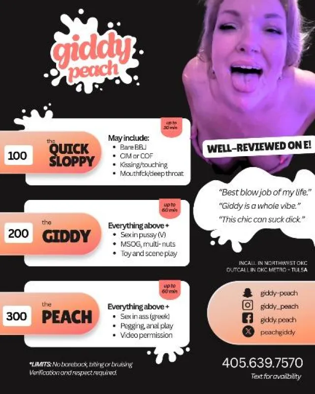 WELL REVIEWED ON E!! I'm a horny milf that aims to please. I love giving sloppy blowjobs, swallowing cum and getting all my holes fucked like a good lil' slut. 5'2 Size 12/14. 38D. Natural tits. Juicy ass and thighs. Soft and freckled. Thick, sturdy and flexible af. Bubbly, outgoing and giddy to make you cum. Open-minded. Dependable. Professional. Safe, discreet. Disease and drama free. ๐๐๐ AVAILABILITY๐๐๐ Mon-Fri 9-4:30 incall, 122nd & MacArthur area. Evening and weekends vary. Text for availability. I book up fast so send a name and pic or verify to be prioritized. ๐๐๐ JULY 4 SPECIAL ๐๐๐ Mini Giddy- Half-hour of svcking and fvcking with CIM, COF, condom in ๐ป Holiday Hours: July 1 - Incall available LATE 9:00pm - 1:00am, outcall July 2 - Incall/outcall available for existing clients only July 3- Incall EARLY 9:00am-4:30pm July 4 - incall/outcall by appointment July 5 - Incall EARLY 9:00am-1:00pm ๐บ๐ธ๐บ๐ธ๐บ๐ธ๐บ๐ธ๐บ๐ธ๐บ๐ธ๐บ๐ธ๐บ๐ธ๐บ๐ธ๐บ๐ธ GIDDY PEACH MENU ๐ 100 Quick & Sloppy - up to 30 min ๐